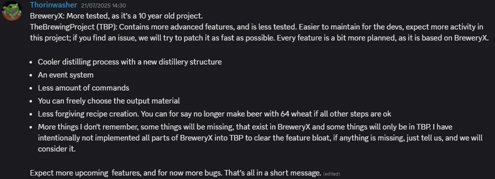 Section titled “At a glance”BreweryX is more tested, as it’s a 10-year-old project, but its rewrite, TBP, has much cleaner code, more advanced features and maintenance priority